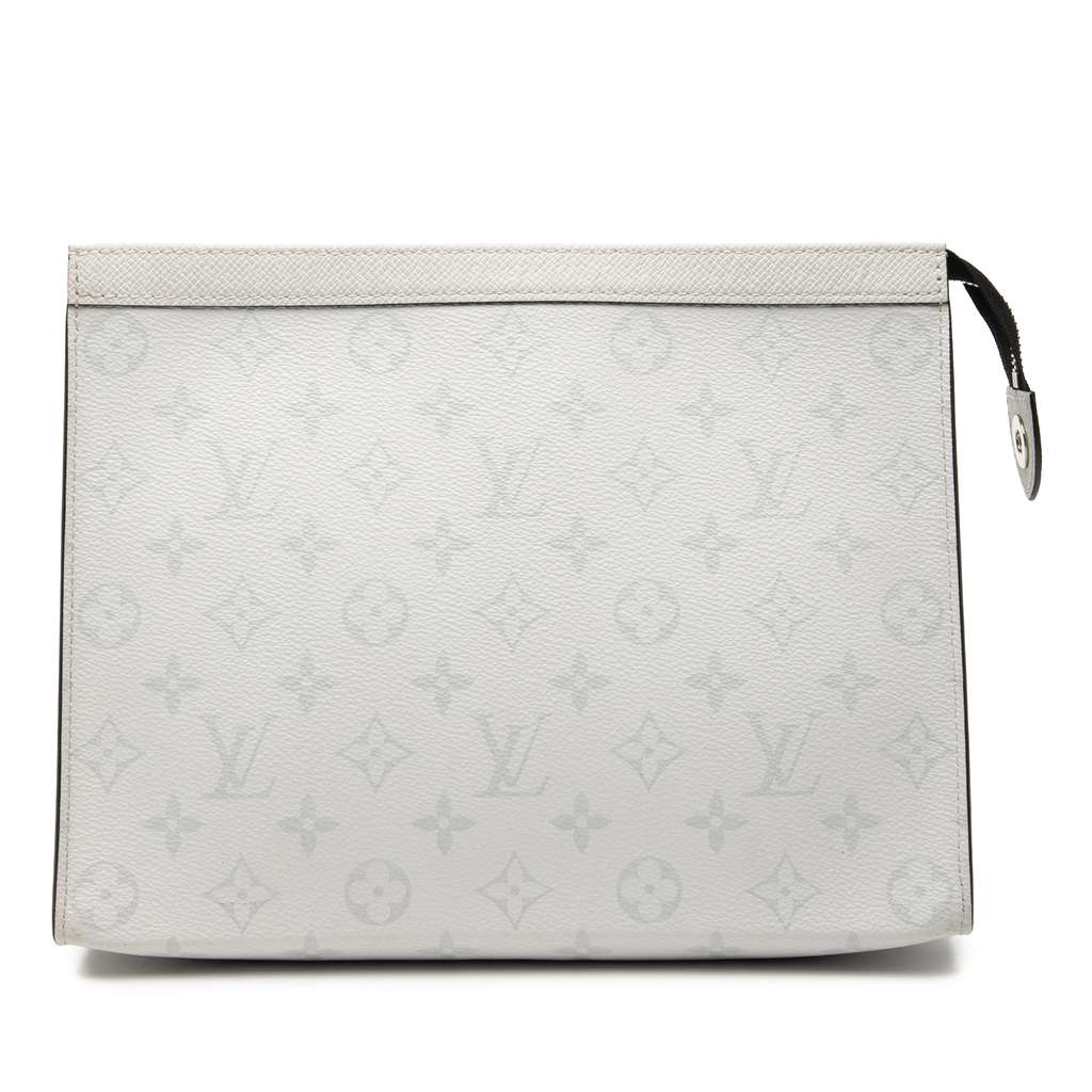 The Pochette Voyage MM features a monogram canvas and taiga leather body, a top zip closure, and an interior slip pocket.