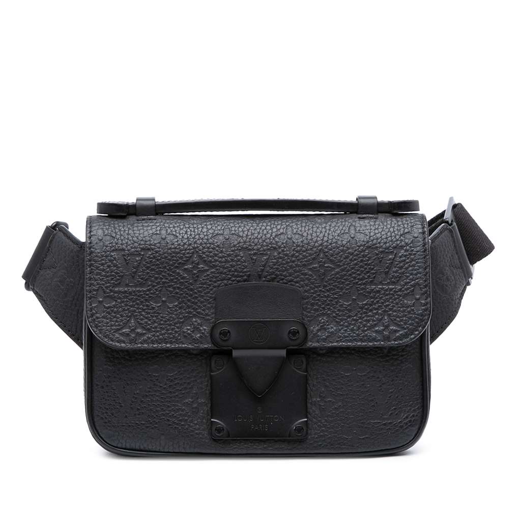 The S Lock Sling features a taurillon leather body, a flat leather top handle, an adjustable flat strap, a front flap with S-lock magnetic closure, an exterior back slip pocket, and an interior zip pocket.
