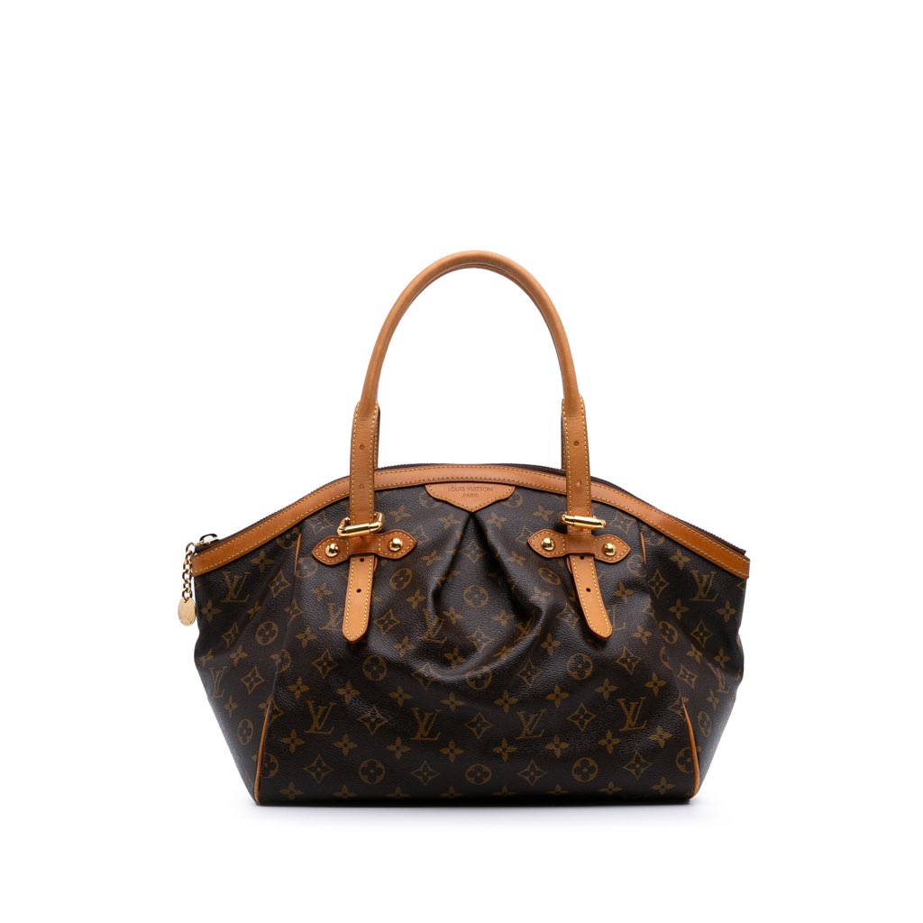 The Tivoli GM features a monogram canvas body with vachetta leather trim, rolled vachetta leather straps, a top zip closure, and interior slip pockets.