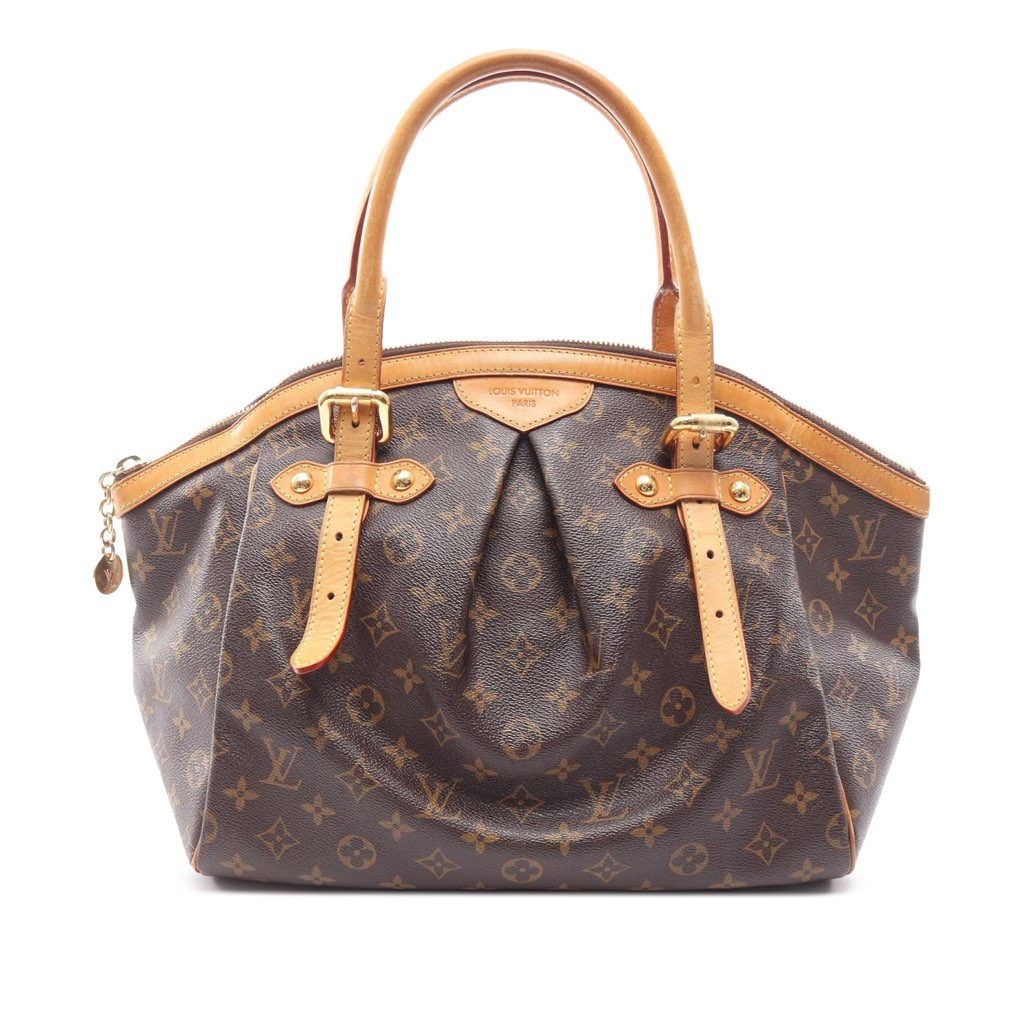 The Tivoli GM features a monogram canvas body with vachetta leather trim, rolled vachetta leather straps, a top zip closure, and interior slip pockets.