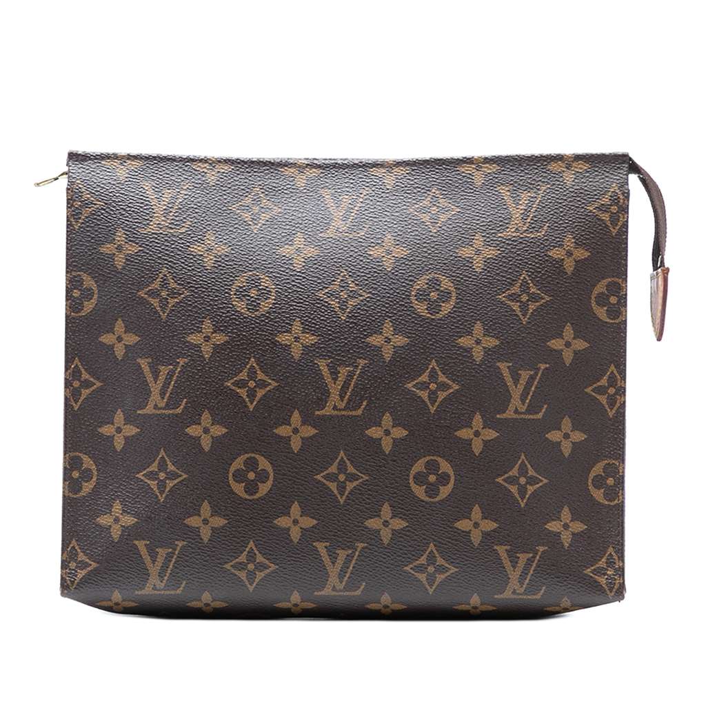 The Toiletry Pouch 26 features a monogram canvas body, and a top zip closure.