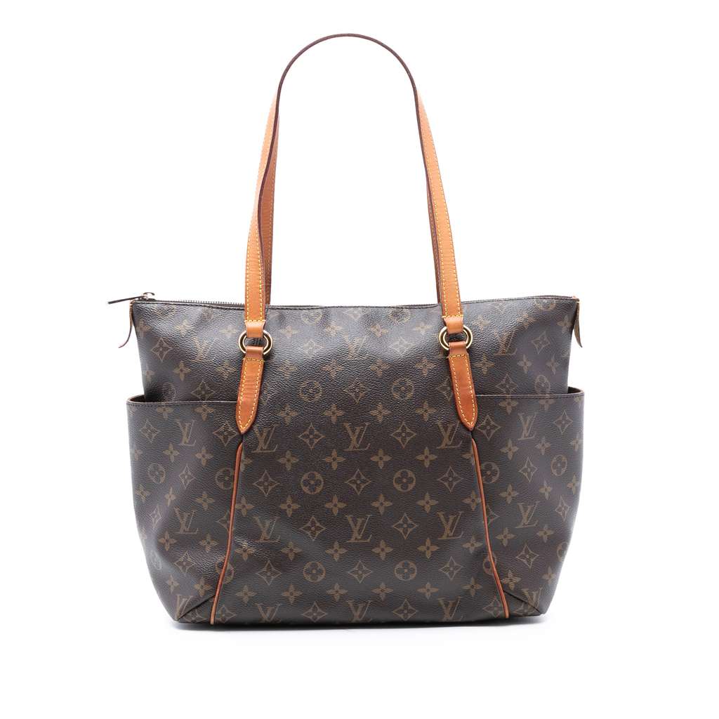 The Totally MM features a monogram canvas body with vachetta leather trim, flat vachetta leather straps, a top zip closure, exterior side open pockets, and interior slip pockets.