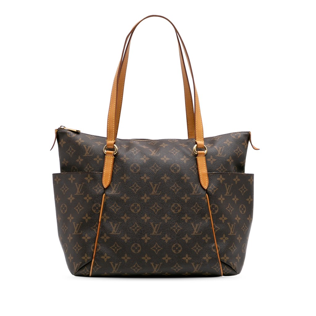 The Totally MM features a monogram canvas body with vachetta leather trim, flat vachetta leather straps, a top zip closure, exterior side slip pockets, and interior slip pockets.