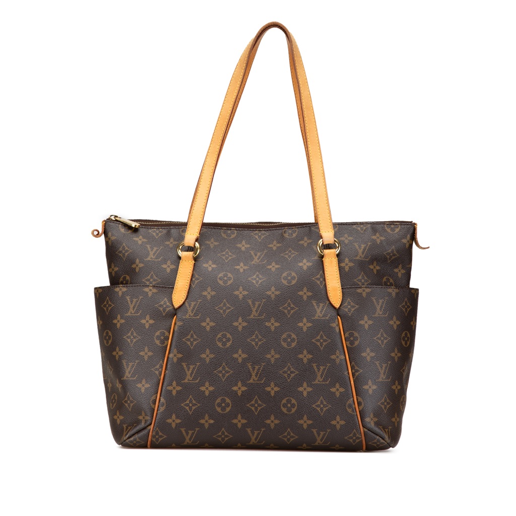 The Totally MM features a monogram canvas body, flat vachetta leather straps, a top zip closure, exterior side open pockets, and an interior slip pocket.