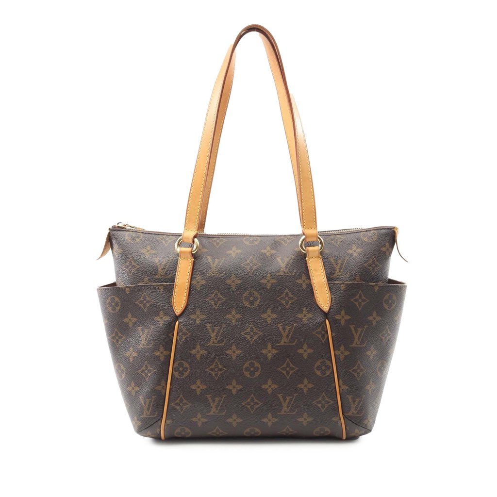 The Totally PM features a monogram canvas body with vachetta leather trim, flat vachetta leather shoulder straps, a top zip closure, exterior side slip pockets, and interior slip pockets.
