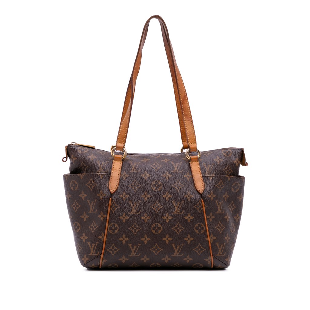 The Totally PM features a monogram canvas body with vachetta leather trim, flat vachetta leather shoulder straps, a top zip closure, exterior side slip pockets, and interior slip pockets.