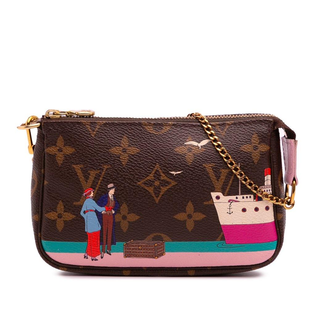 The Mini Pochette Accessoires features a printed monogram canvas body, a chain link strap, and a top zip closure.