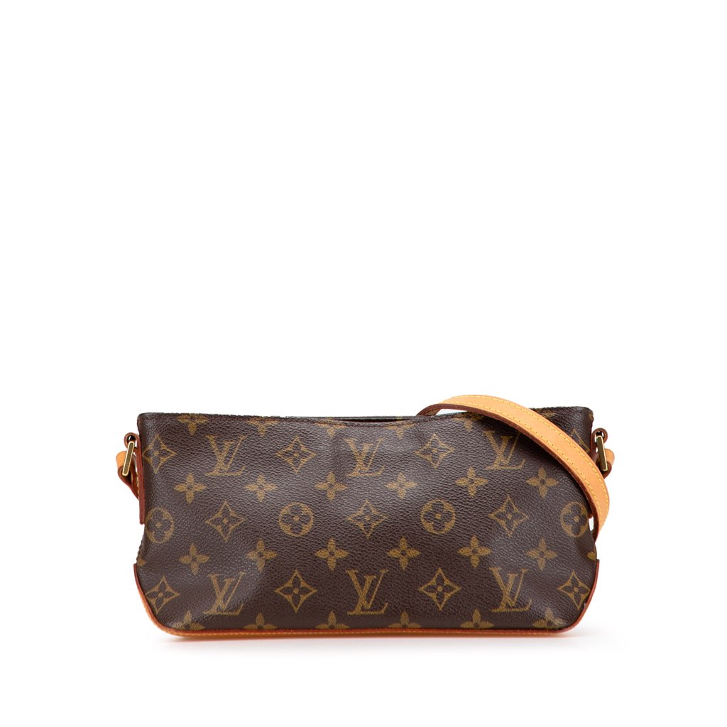 The Trotteur features a monogram canvas body with vachetta leather trim, a flat vachetta leather strap, a top zip closure, and an interior zip pocket.