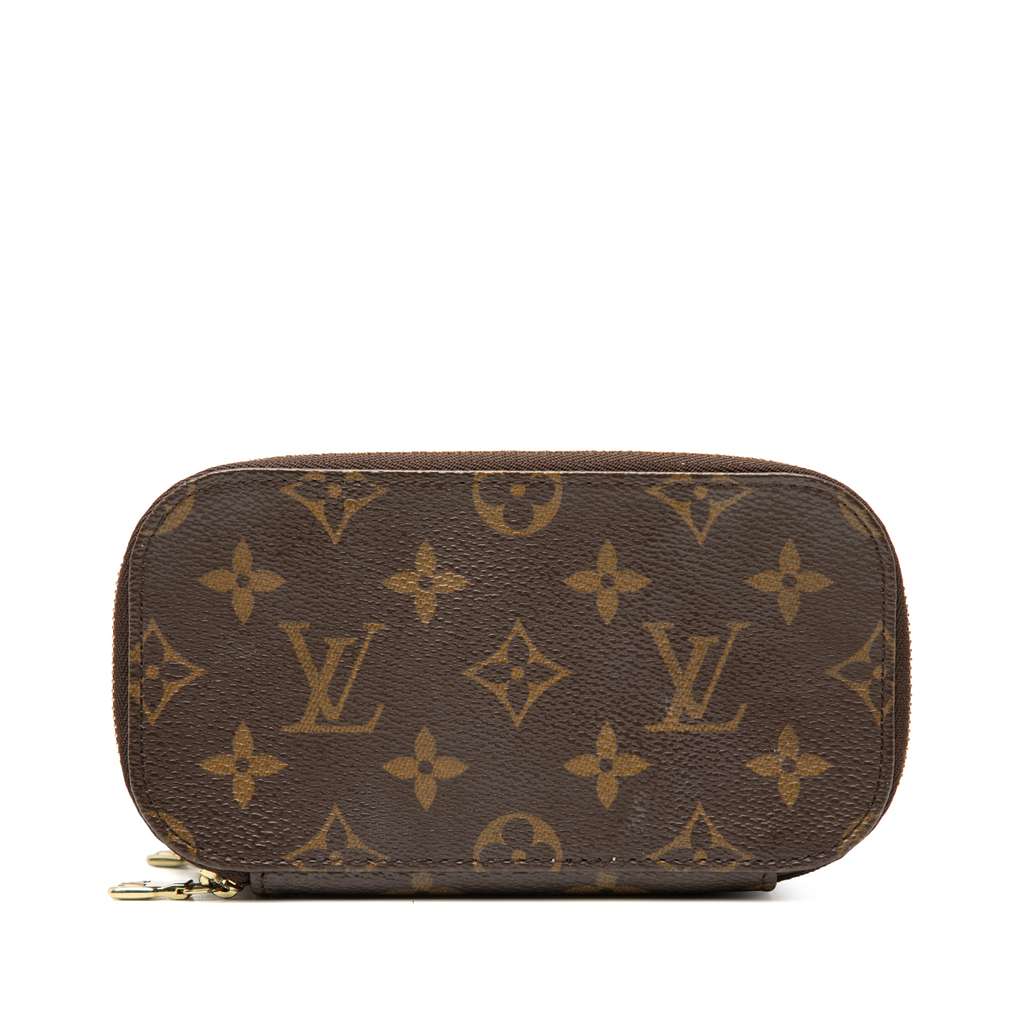 The Trousse Blush PM features a monogram canvas body, zip-around closures, an interior slip pocket, and interior brush holders.