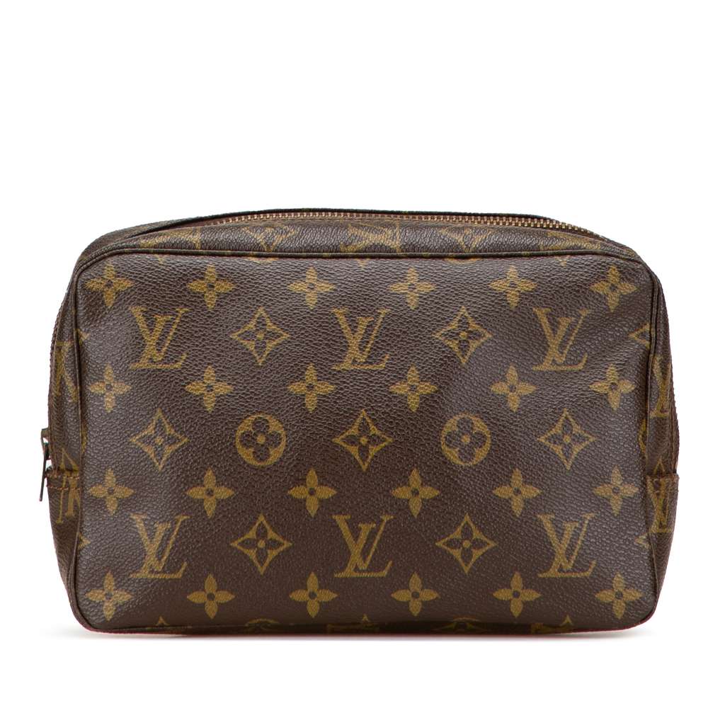 The Trousse Toilette features a monogram canvas body, a top zip closure, and an interior pockets.
