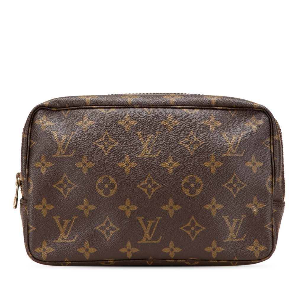 The Trousse Toilette features a monogram canvas body, a top zip closure, and an interior slip pocket.