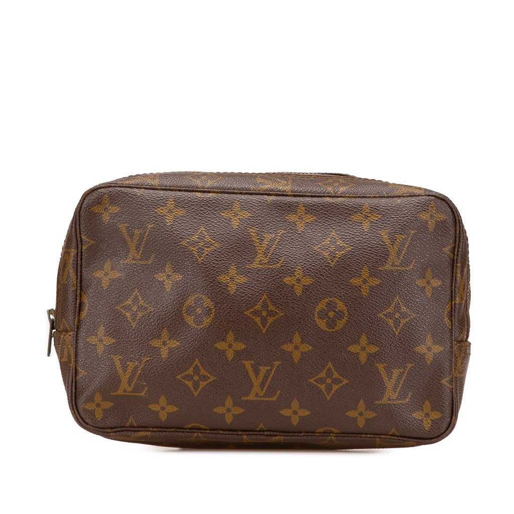 The Trousse Toilette features a monogram canvas body, a top zip closure, and interior slip pockets.
