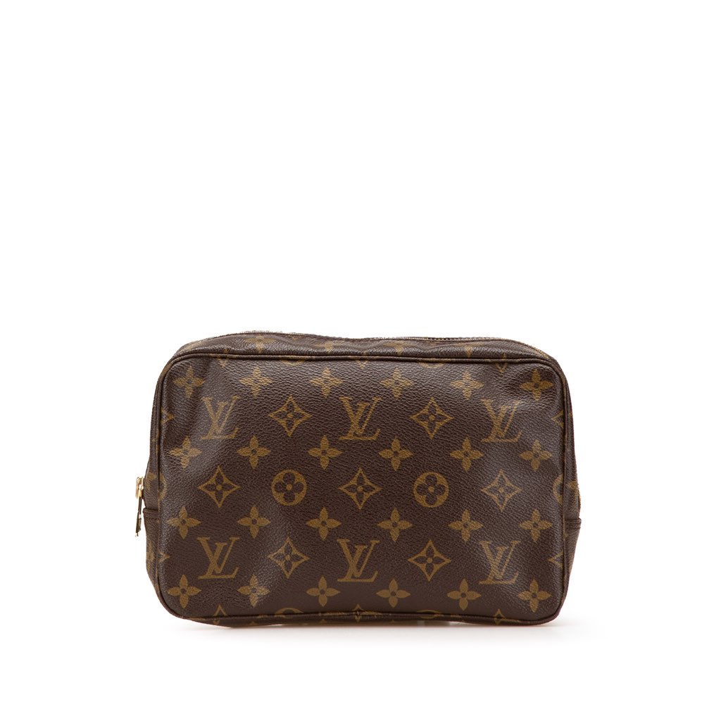 The Trousse Toilette features a monogram canvas body, a top zip closure, and an interior slip pocket.