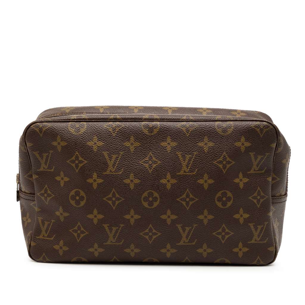 The Trousse Toilette 28 features a monogram canvas body, a top zip closure, and an interior slip pocket.