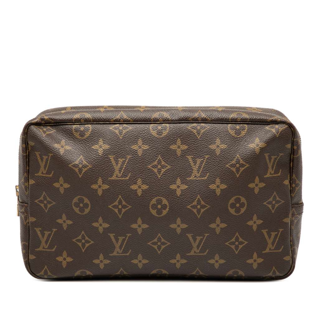 The Trousse Toilette 28 features a monogram canvas body, a top zip closure, and an interior slip pocket.