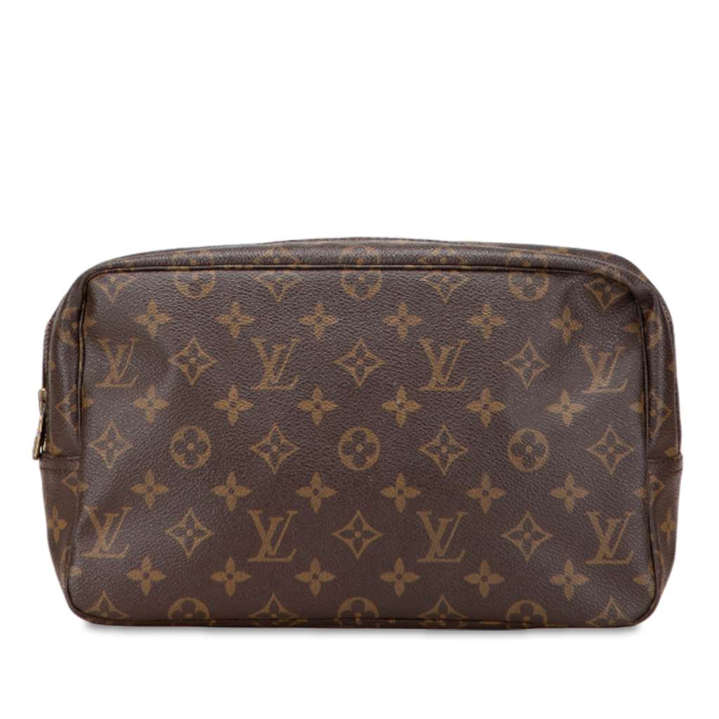The Trousse Toilette 28 features a monogram canvas body, a top zip closure, and an interior slip pocket.