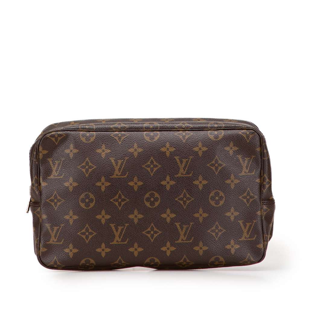 The Trousse Toilette 28 features a monogram canvas body, a top zip closure, and an interior slip pocket.