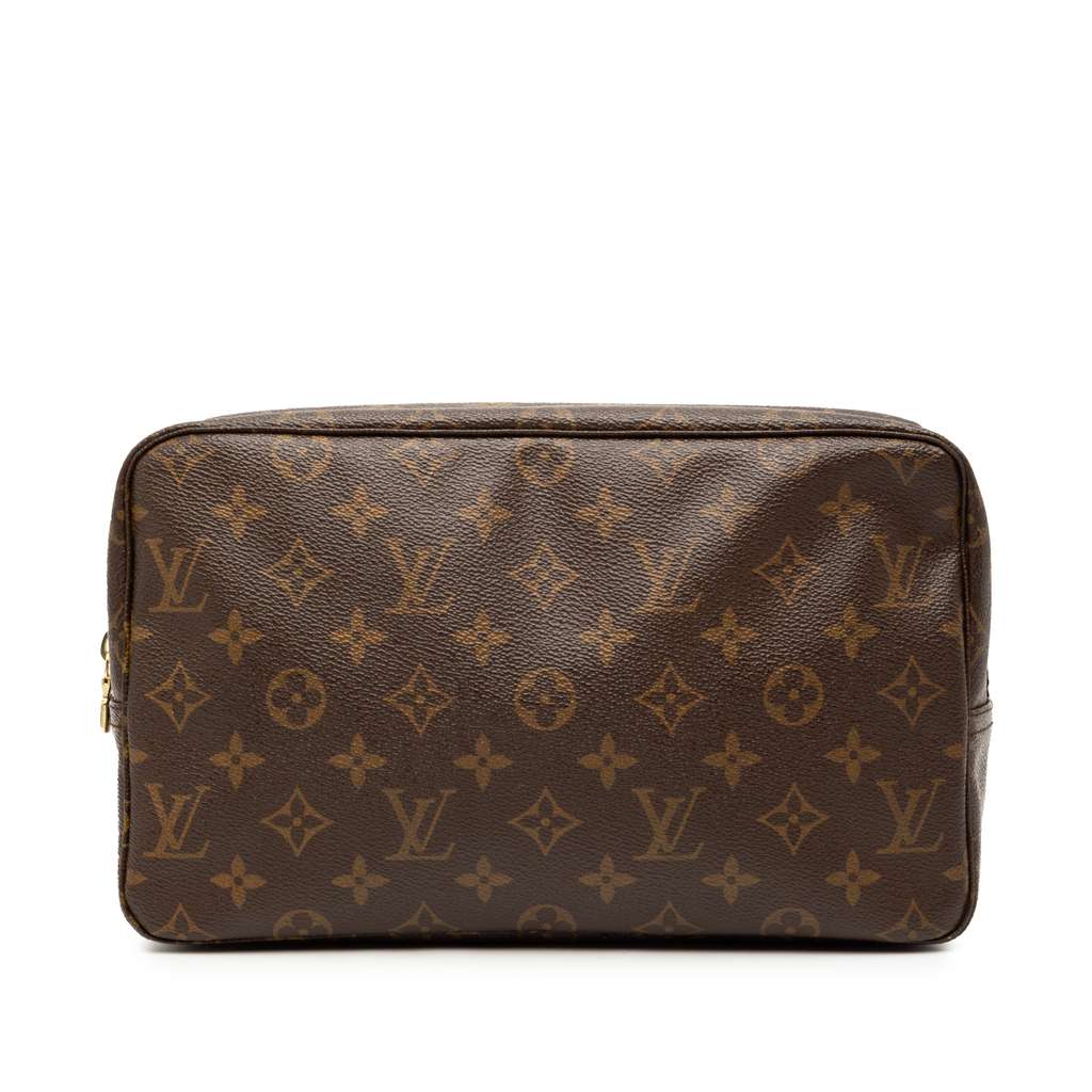 The Trousse Toilette 28 features a monogram canvas body, a top zip closure, and an interior slip pocket.