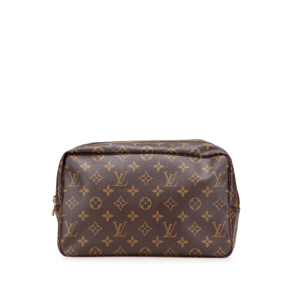 The Trousse Toilette 28 features a monogram canvas body, a top zip closure, and an interior slip pocket.
