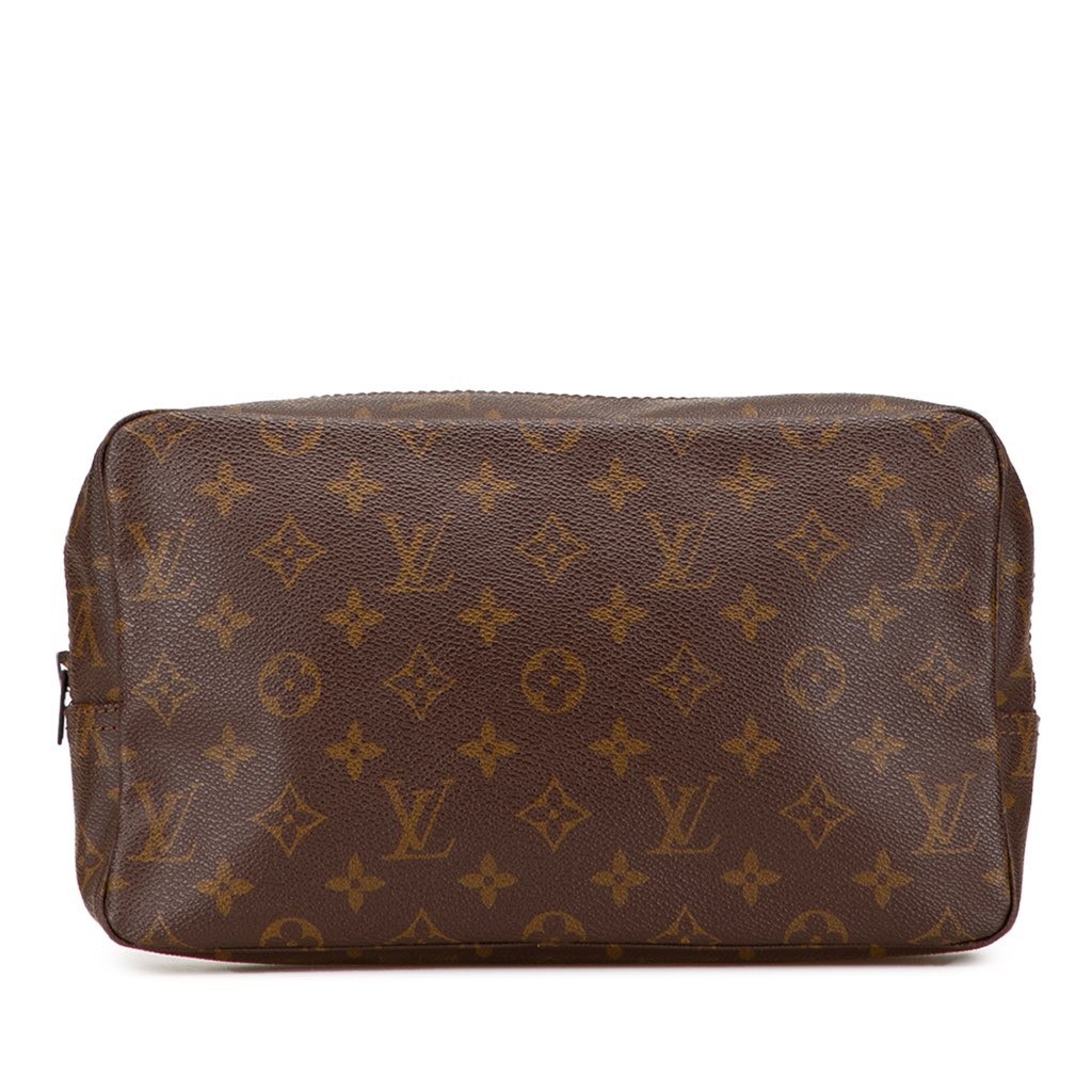 The Trousse Toilette 28 features a monogram canvas body, a top zip closure, and an interior slip pocket.