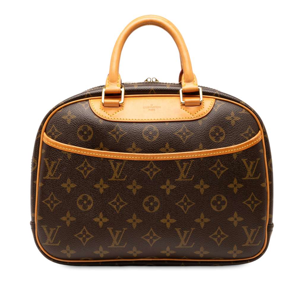 The Trouville features a monogram canvas with vachetta leather trim, rolled vachetta leather top handles, a top zip closure, an exterior front slip pocket, and interior open pockets.