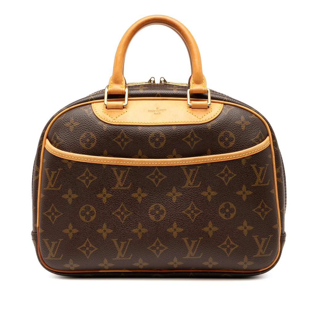 The Trouville features a monogram canvas with vachetta leather trim, rolled vachetta leather handles, a top zip closure, an exterior front slip pocket, and interior open pockets.