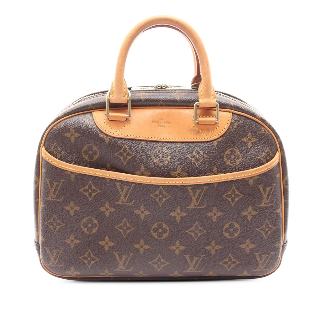 The Trouville features a monogram canvas body with vachetta leather trim, rolled vachetta leather handles, a top zip closure, an exterior front slip pocket, and interior open pockets.