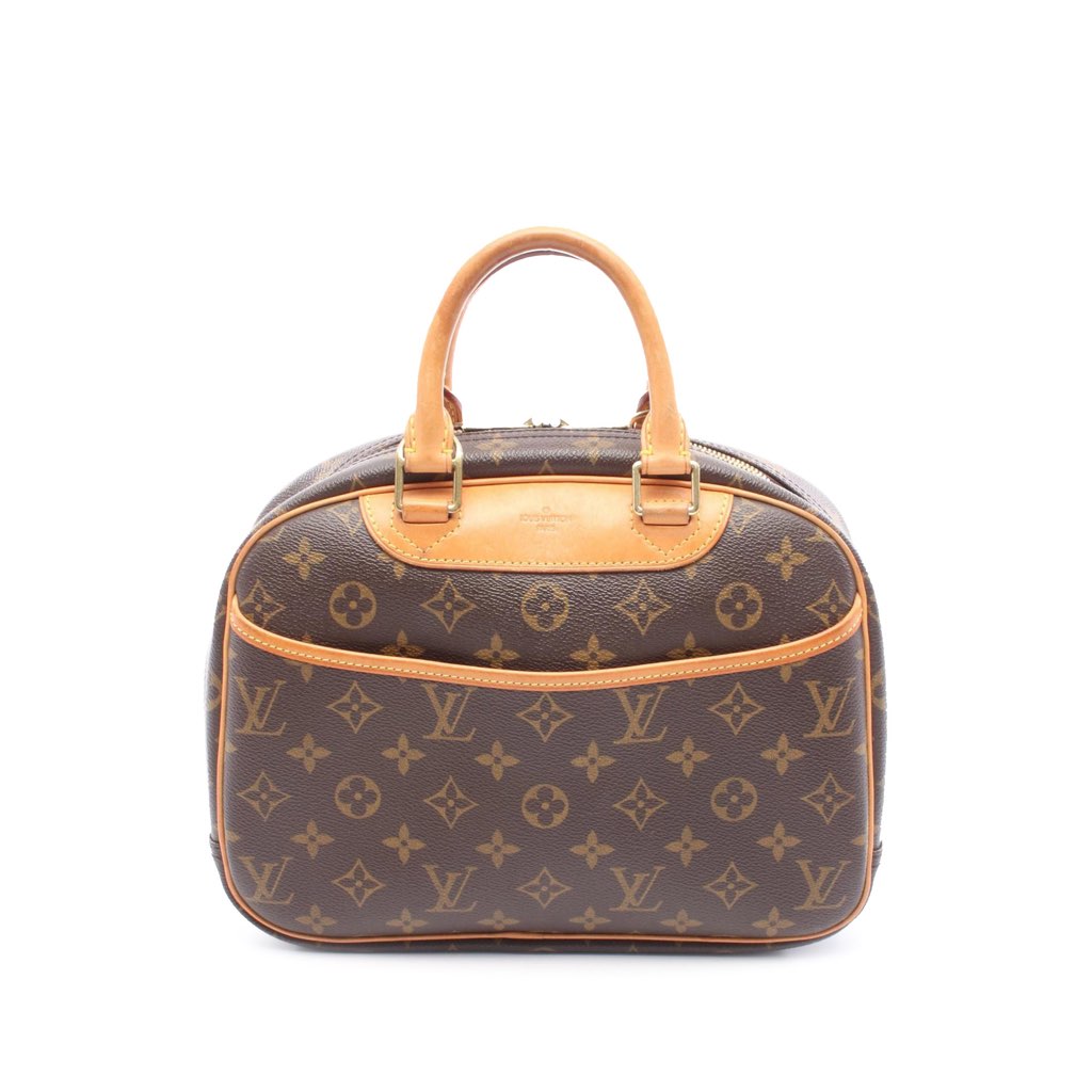 The Trouville features a monogram canvas body with vachetta leather trim, rolled vachetta leather handles, a top zip closure, an exterior front slip pocket, and interior open pockets.