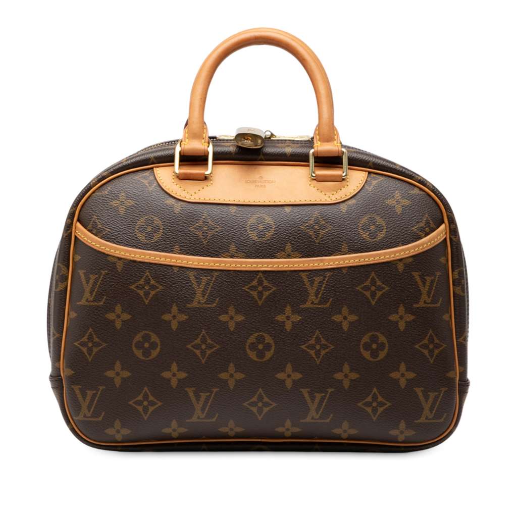 The Trouville features a monogram canvas with vachetta leather trim, rolled vachetta leather handles, a top zip closure, an exterior front slip pocket, and interior open pockets.