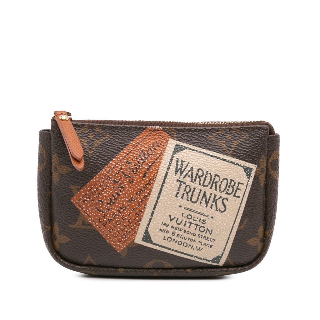 The Pochette Cles features a printed monogram canvas body and a top zip closure.
