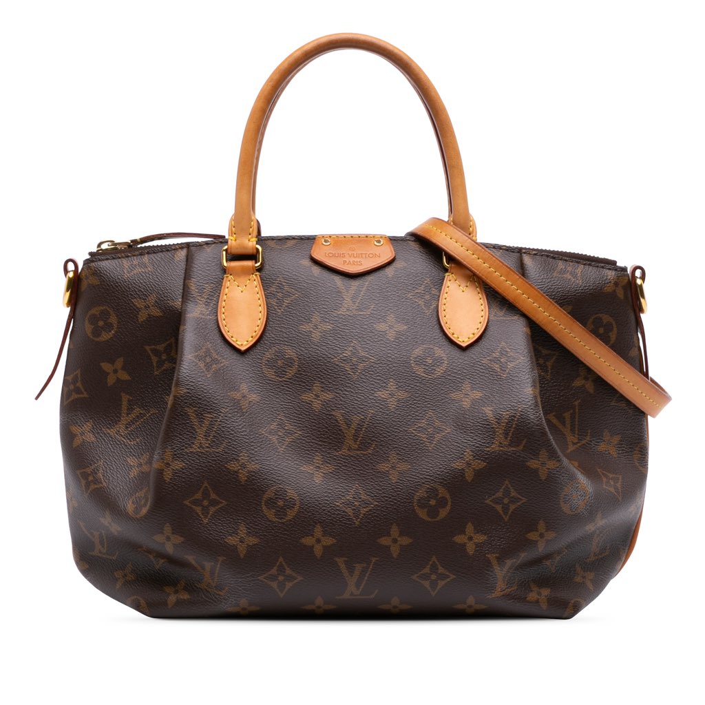 The Turenne PM features a monogram canvas body with vachetta leather trim, rolled vachetta leather handles, a detachable flat vachetta leather strap, a top zip closure, and interior slip pockets.