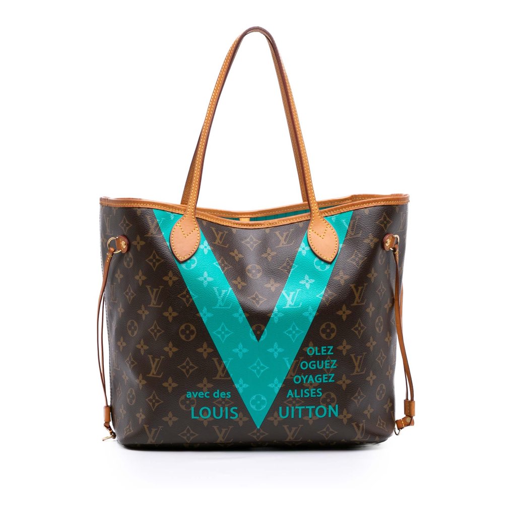 The Neverfull MM features a monogram canvas body with V print and vachetta leather trim, flat vachetta leather straps, an open top with lobster clasp closure, and an interior zip pocket.