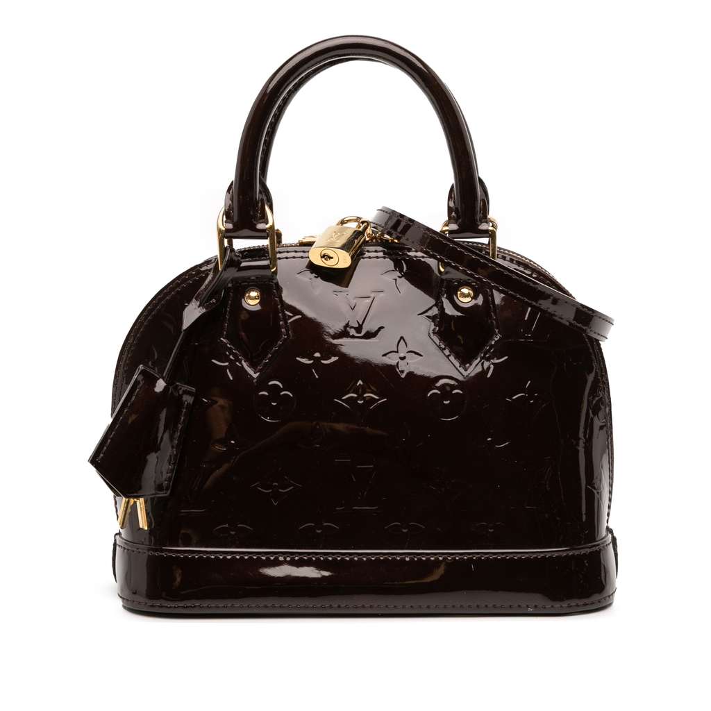 The Alma BB features a monogram vernis leather body, a clochette, rolled leather handles, a detachable flat leather strap, a top zip around closure, and an interior slip pocket.
