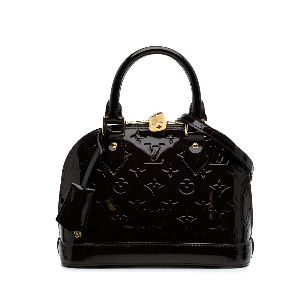 The Alma BB features a monogram vernis leather body, rolled leather handles, a top zip-around closure, a clochette, and an interior slip pocket.