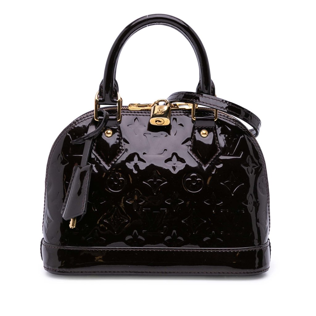 The Alma BB features a monogram vernis leather body, rolled leather handles, a detachable flat strap, a zip around closure, a clochette, and an interior slip pocket.