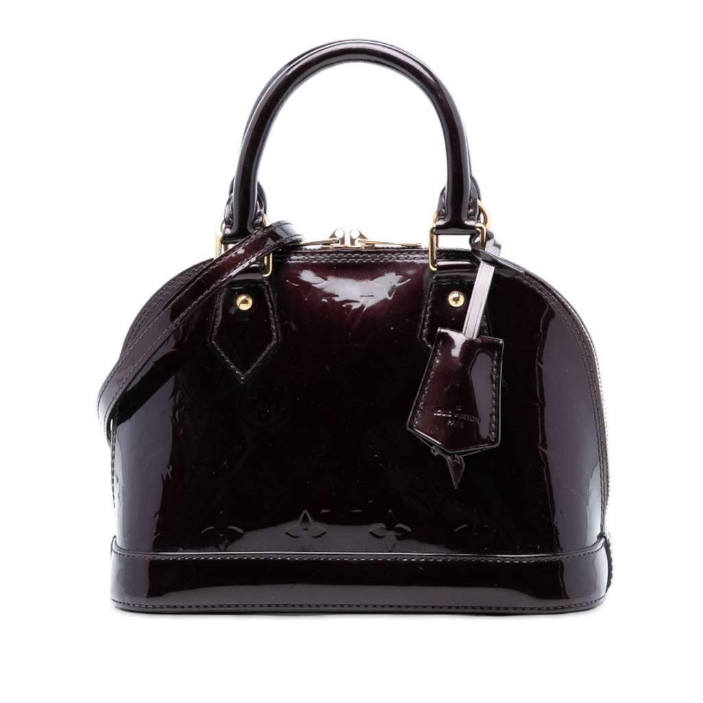 The Alma BB features a monogram vernis leather body, a clochette, rolled leather handles, a detachable flat leather strap, a zip-around closure, and an interior slip pocket.