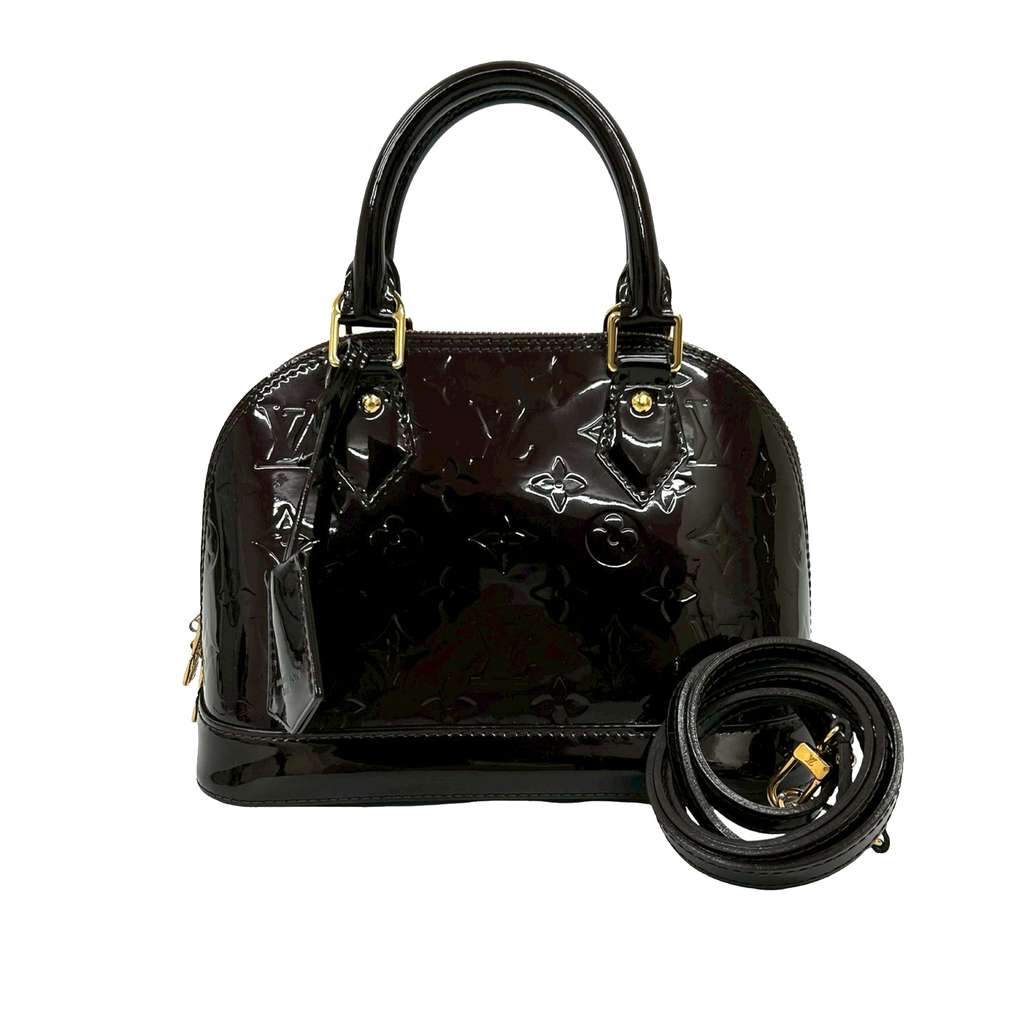 The Alma BB features a monogram vernis leather body, rolled leather handles, a detachable flat strap, a zip around closure, a clochette, and an interior slip pocket.