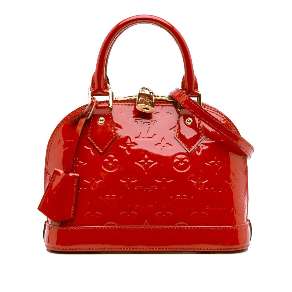 The Alma BB features a monogram vernis leather body, rolled leather handles, a detachable leather strap, a top zip around closure, and an interior slip pocket.