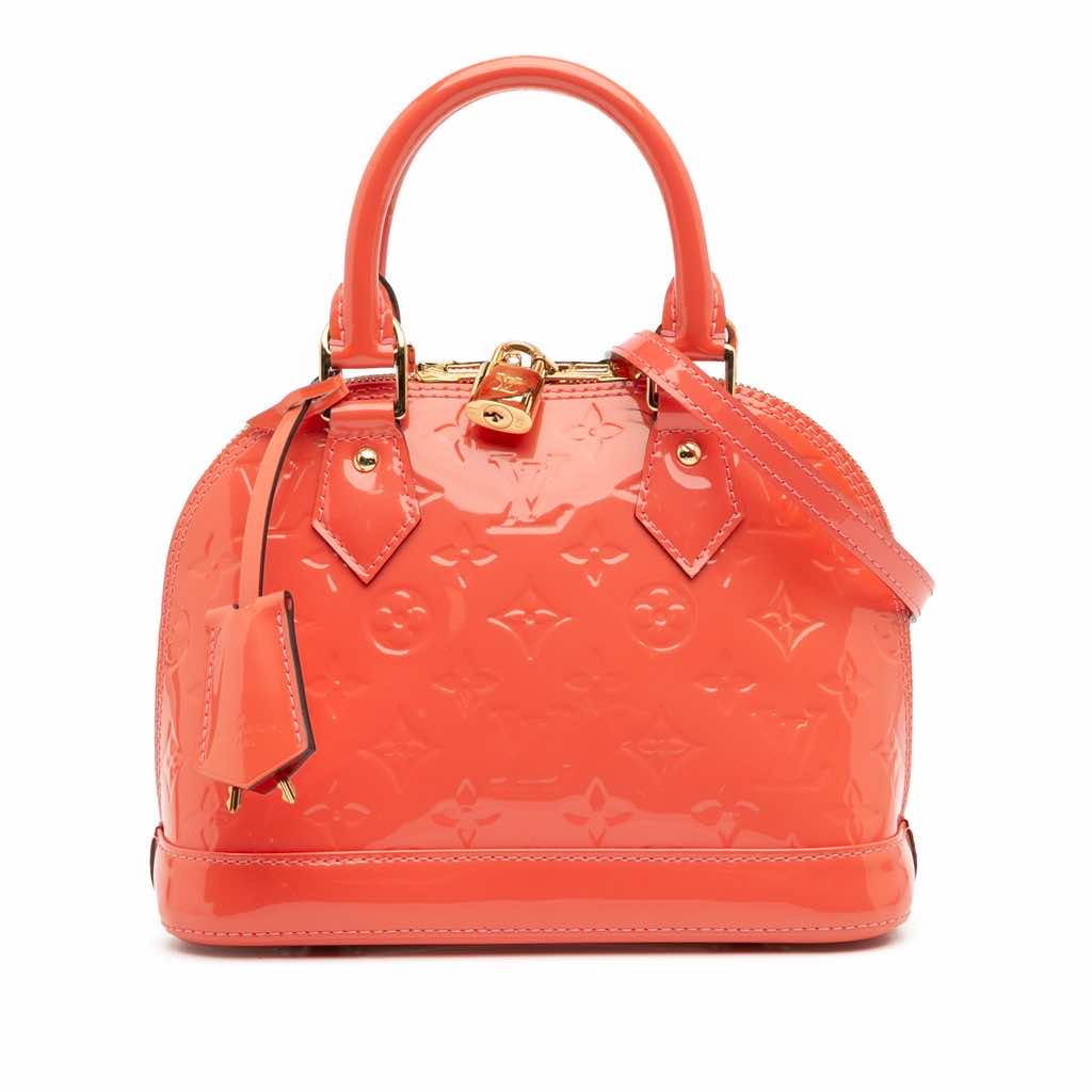 The Alma BB features a vernis leather body, rolled leather top handles, a detachable flat leather strap, a top zip closure, and an interior slip pocket.