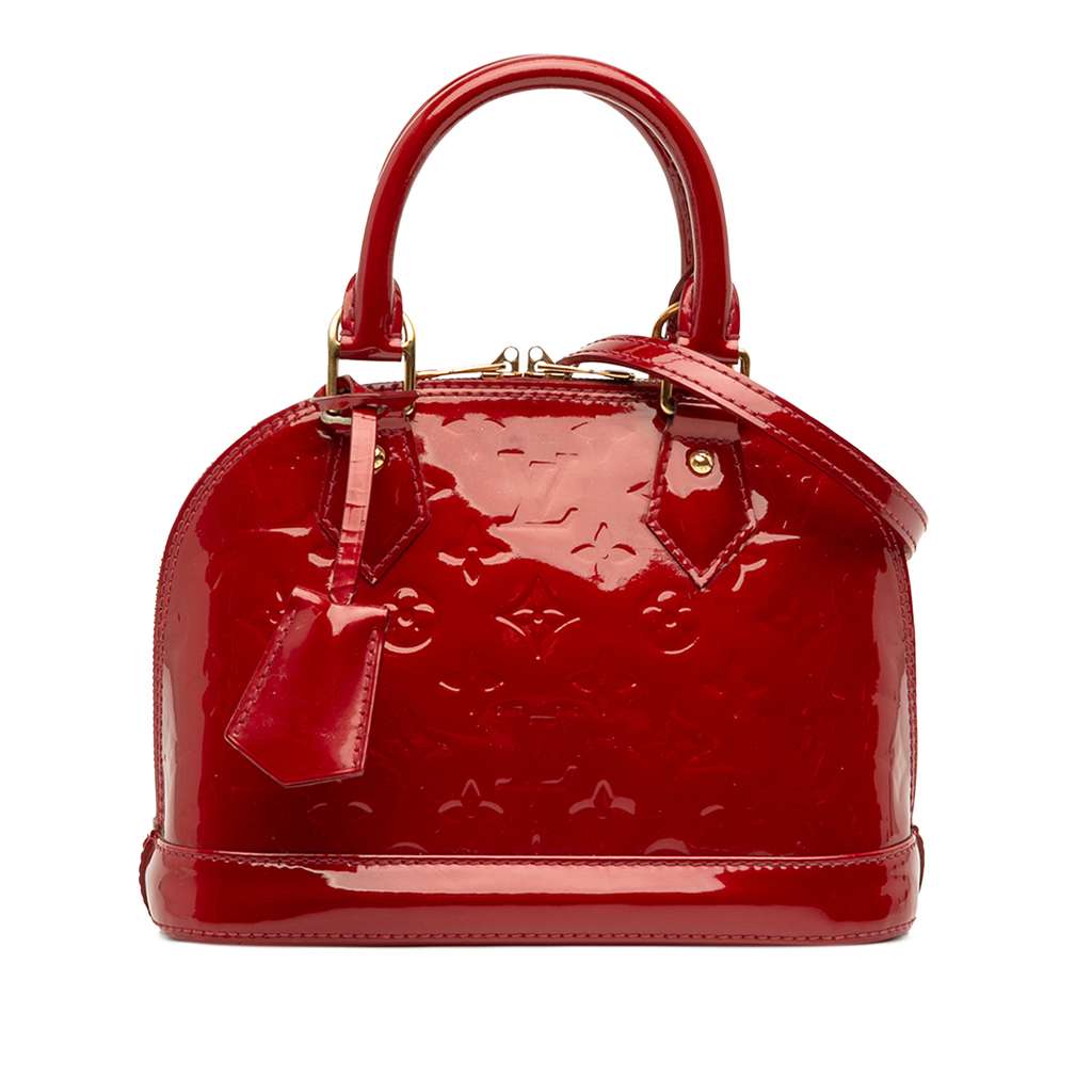 The Alma BB features a monogram vernis leather body, rolled leather handles, a detachable leather strap, a zip around closure, a clochette, and an interior slip pocket.