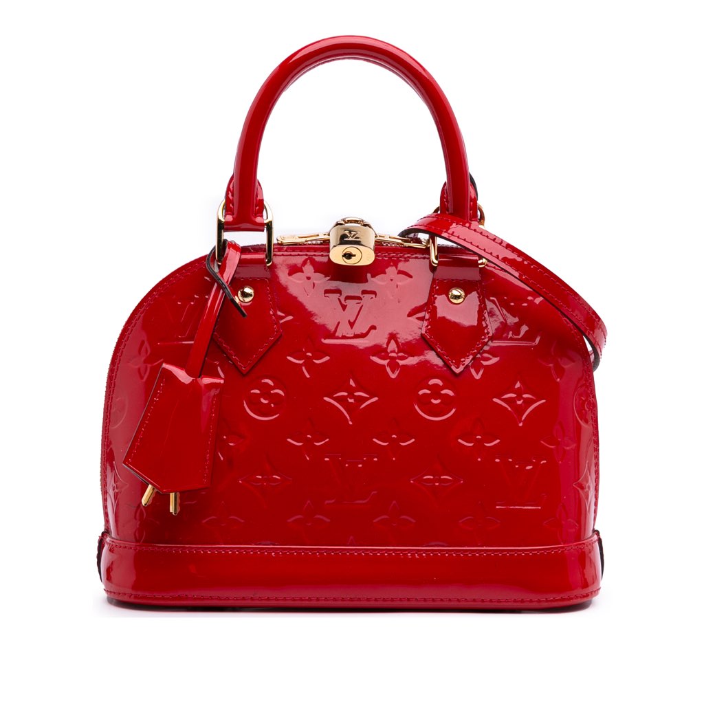 The Alma BB features a monogram vernis leather body, a clochette, rolled leather handles, a detachable flat leather strap, a top zip-around closure, and an interior slip pocket.