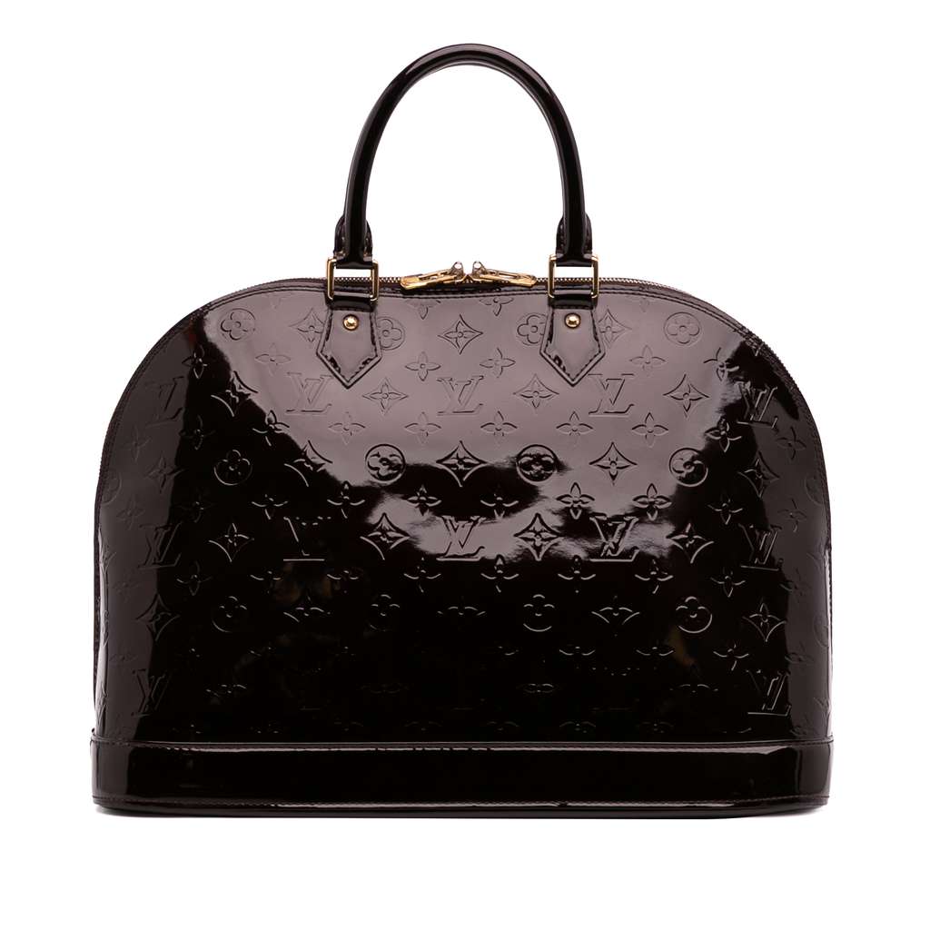 The Alma GM features a vernis body, rolled handles, gold-tone hardware, a top zip closure, and interior slip pockets.