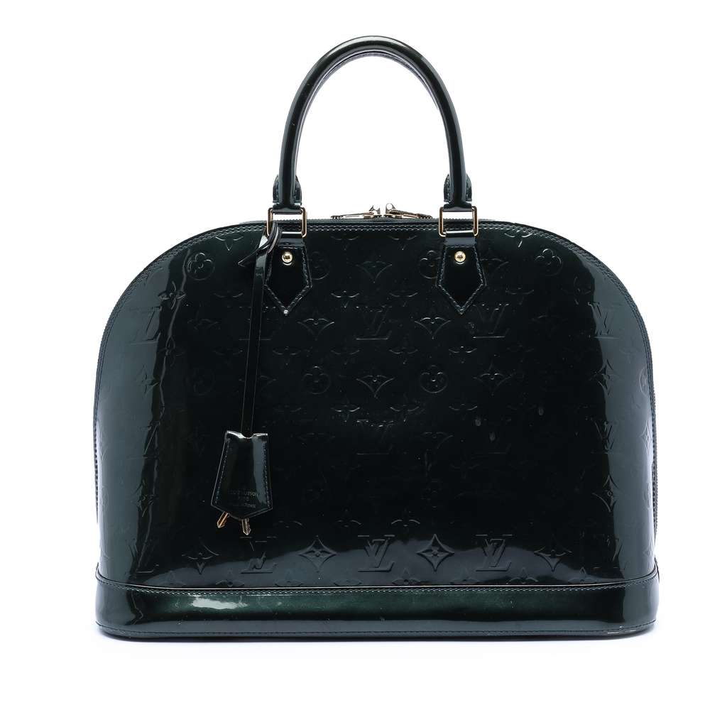 The Alma GM features a vernis leather body, rolled leather handles, a clochette, a top zip closure, and interior slip pockets.