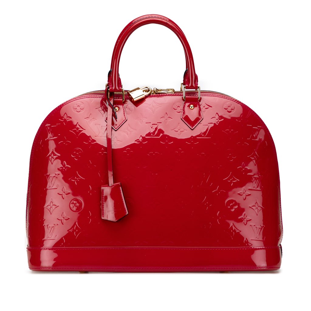 This handbag features a vernis leather body, rolled leather handles, a top zip-around closure, and interior slip pockets.