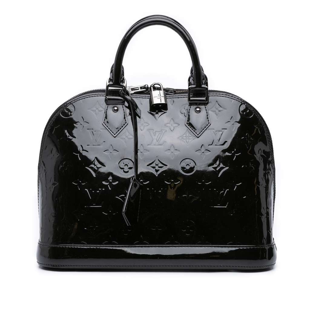 The Alma PM features a monogram vernis leather body, rolled handles, a clochette, a top zip closure, and interior slip pockets.