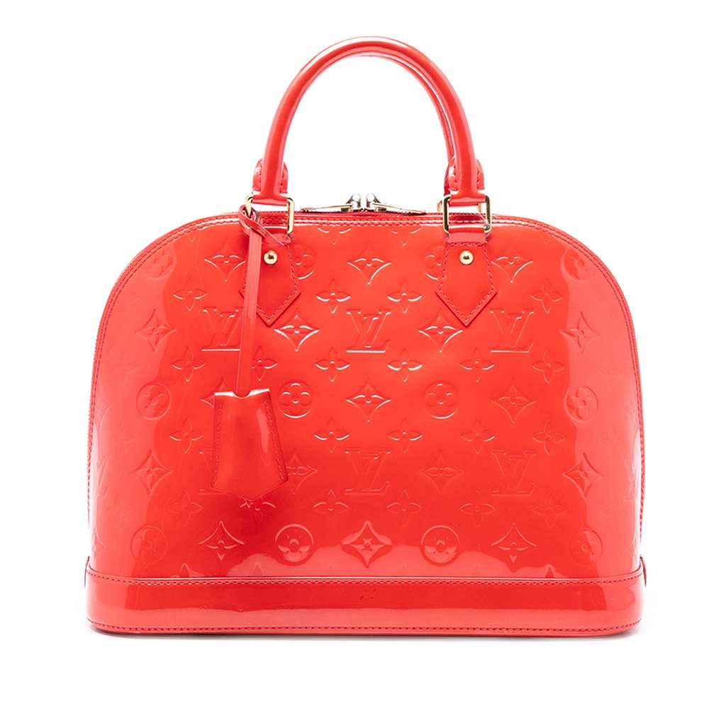 The Alma PM features a monogram vernis leather body, a clochette, rolled leather handles, a top zip closure, and interior slip pockets.