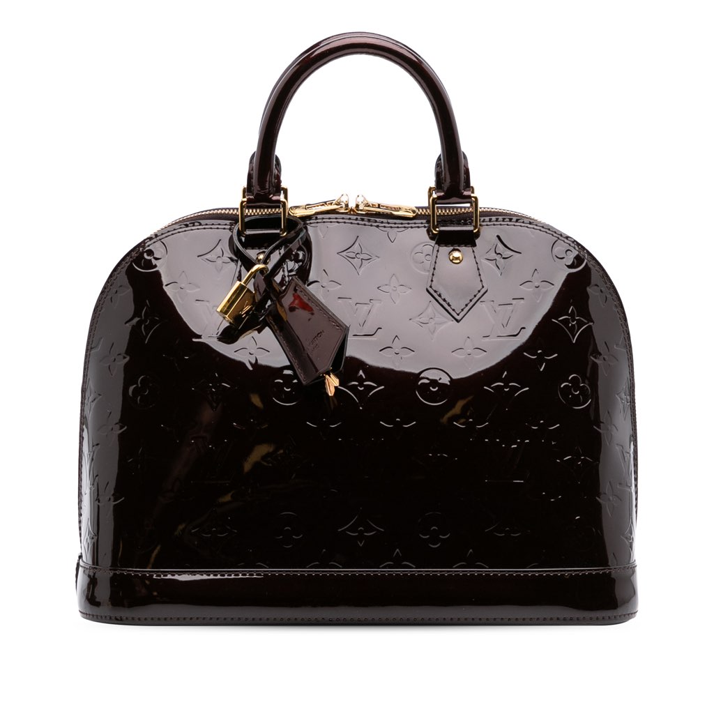 The Alma PM features a monogram vernis leather body, rolled leather handles, a top zip closure, and interior slip pockets.