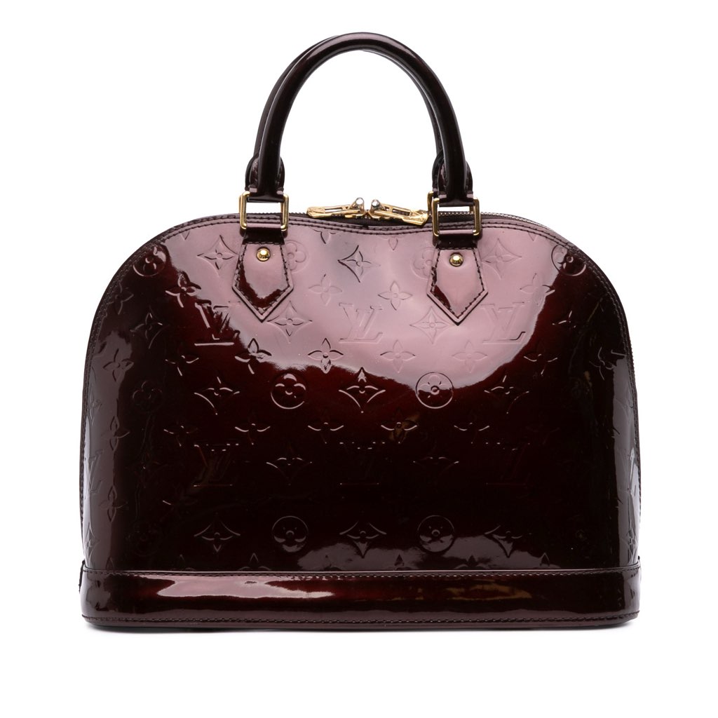 The Alma PM features a monogram vernis leather body, rolled leather handles, a top zip closure, and interior slip pockets.