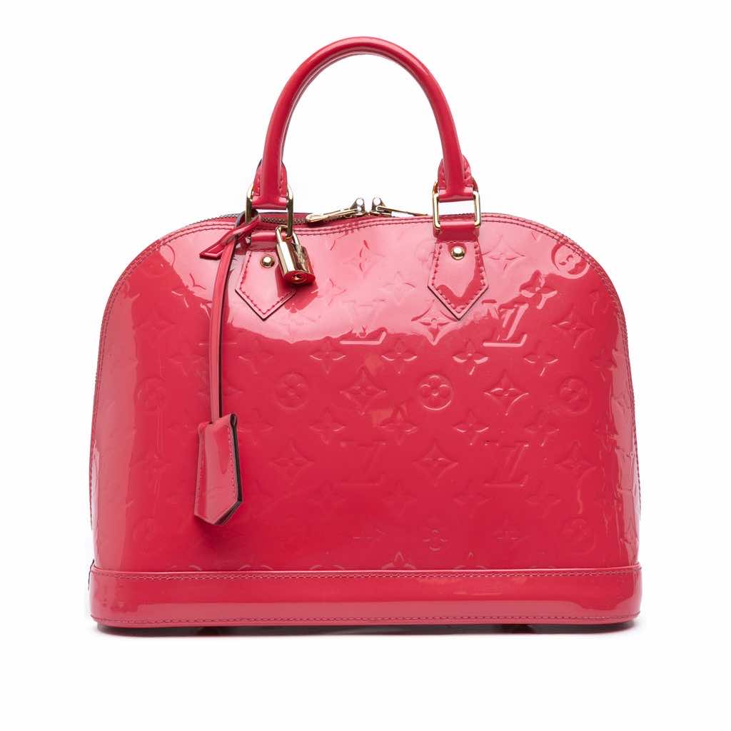 The Alma features a monogram vernis leather body, a clochette, rolled leather handles, a top zip closure, and interior slip pockets.