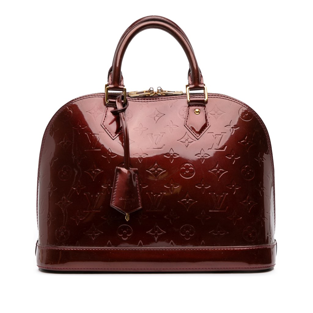 The Alma PM features a monogram vernis leather body, rolled leather handles, a top zip closure, and interior slip pockets.
